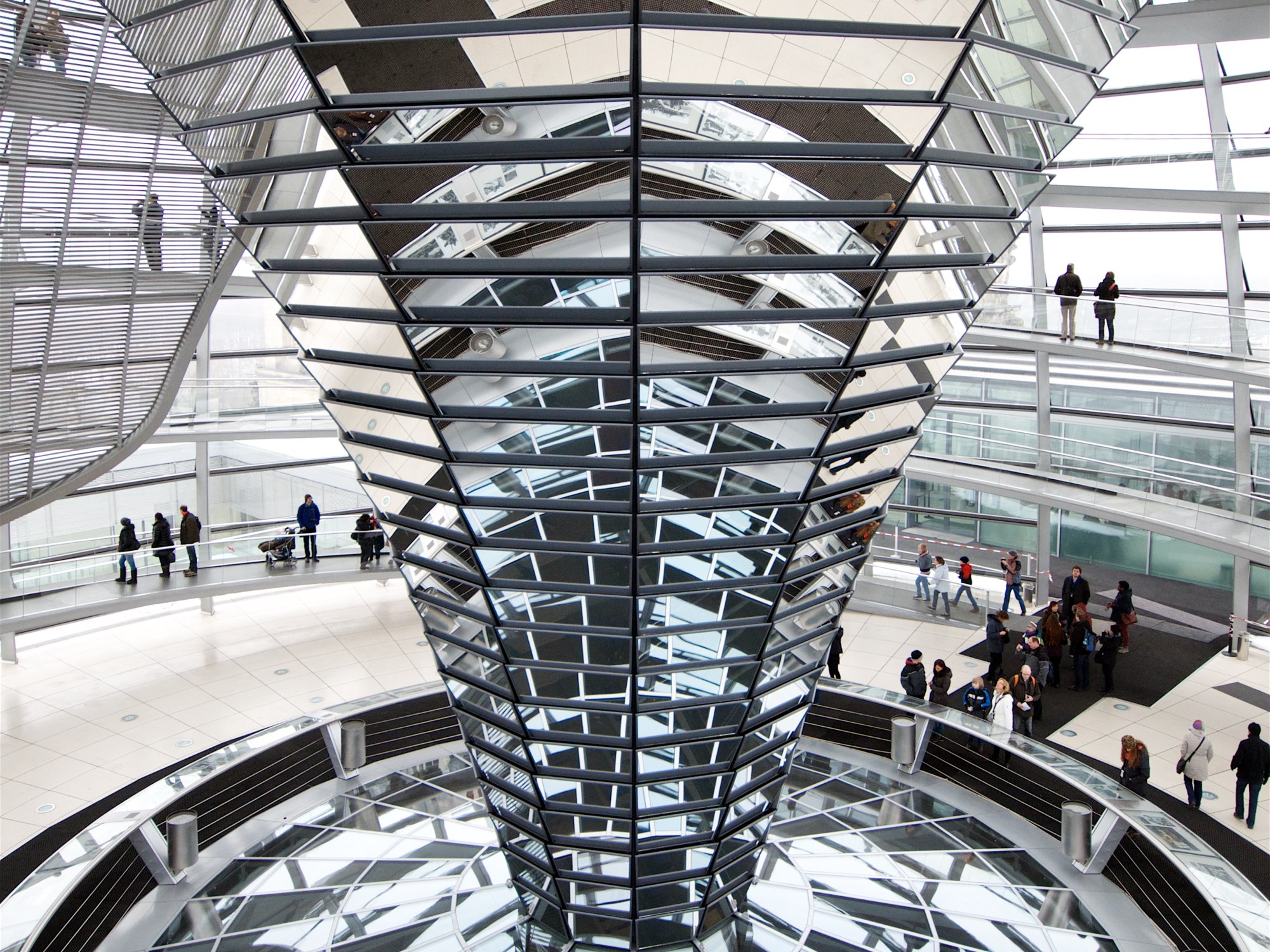 There is a saying that goes something like “those who do not learn from their history are failed to repeat it.” Well, Berlin is a city design to ensure that no one ever forgets what happened here all those years ago. After a good nights sleep on Rays part (and a disconnected sleep on mine, for those of you who saw my 3am facebook post) we started off for the day around 9:00am, enjoying a leisurely stroll, though the lightly falling snow and cool winter breeze (and a nippy -4 degrees C) along the river Spree towards the Reichstag, the German Parliamentary Building. The Dome of the Reichstag, to which we were about to tour, is clear, symbolizing the transparency of the German Democratic Process. After making our way through security, we were escorted to the top of the building where Ray enjoyed the free audio tour, and I enjoyed taking pictures while he told me about all the things he was learning from the free audio tour. The center of the dome is filled with mirrors, which reflect sunlight down into the parliamentary chambers. Going through the history of German Politics over the last 80 years it is amazing how much they have been through. The visit here was fantastic and a definite must experience for Berlin. Ray was busy getting his history on, and loving every minute of it. From the top we could see the large line across the street of people trying to get tickets, as a trip to the top is by reservation only. I was grateful that we had booked in advance. (See…planning can pay off!)