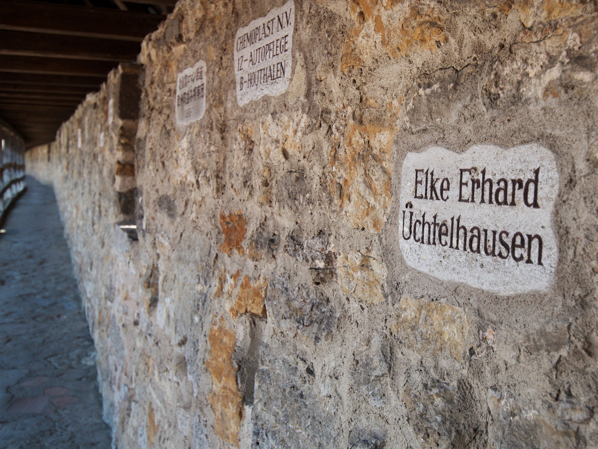 Rothenburg ob der Tauber, or just Rothenburg (ROE-ten-BURG) is a 1000+ year old Medieval city, surrounded by it’s original wall, complete with 24 towers, a dungeon and all the cuteness of a town with legit (ankle rolling) cobblestone roads and competing church bells. The town was HUGE (one of the 20 biggest in the Roman Empire) back its heyday, when it was RICH, making money off of textile exports (the surrounding fields, now used for wine, were then full of sheep). For 500 years this town was the perfect stop over place for visitors traveling north to south (Scandanavia to Rome) or east to west from Prague to Paris. Then of course the plague came, and people died. Then they started to rebuild a small amount of momentum, which was quickly taken away during the thirty years war, when the Catholics decided they wanted to take refuge from the mud and rain in the nearest town – protestant Rotheburg. Of course it was a religious war, and they weren’t super excited about this idea, so for 3 days they fought off the army from inside the tower walls – killing over 300 Catholics and taking no casulties….until….according to the night watchman, one of Rothenburgs own went to check, in the dark, on the gun powder supply, in a tower….and of course it was dark….so he took in his torch. And tower go boom. According to the night watchman (who recounts the town’s history during a 1 hour walking tour done at night), this blew a whole in the wall right in front of where the Catholic army stood. And such was the beginning of 17 years of occupation. And they brought more diseases, and by the time everything was said and done, Rothenburg was no longer a rich giant city, but small and poor and forgotten. And in the late 1800’s tourists started. And then came WWI….and then WWII….and then the American’s, in the fog (fortunatly) came to bomb the city – and missed the town center, but did take out a piece of the wall (this was in 1945, near the end of the war). At the time there was an important American defence/army folk (this is where names have escaped me) who was in the area, and he knew about the town because his MOTHER had been a tourist and he grew up with a picture on the wall. And he wasn’t inclined to see if blown up. So he intervened and gave them a chance to surrender. And the same time, the German troops in the city were without their General, and they didn’t know when he would return. The highest ranking German knew the war was nearing end, and though negotiating was forbidden, he accepted the American’s offer to surrender. So the German’s met with the Americans on the doppelbrücke (double bridge – pics to come in a later post) and surrendered the towns. They left, Americans took over, town was spared. Except the big hole in the wall. So they asked the world, by an ad in a magazine, to sponsor a meter of the wall. And they did!