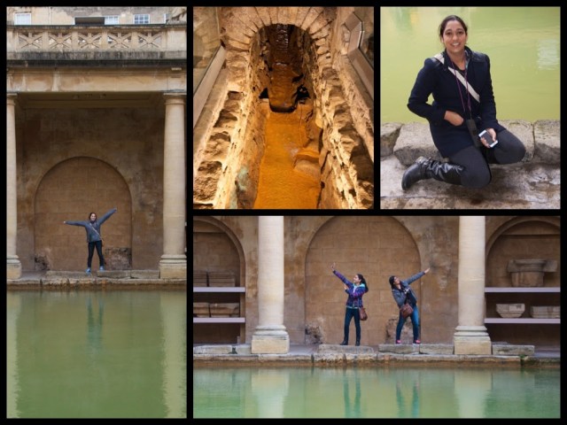 | Harleen (left), Ms. Mulji (top right), and Suesha & Rene (bottom right), in the main pump room of the Roman Baths. |