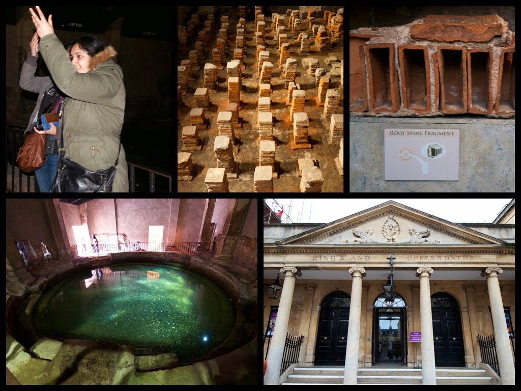 | Shelby (left), Harjot (top right), and Kimmi & Qudrat (bottom right) in the main pump room of the Roman Baths, + view of spring with hot water (top centre) |
