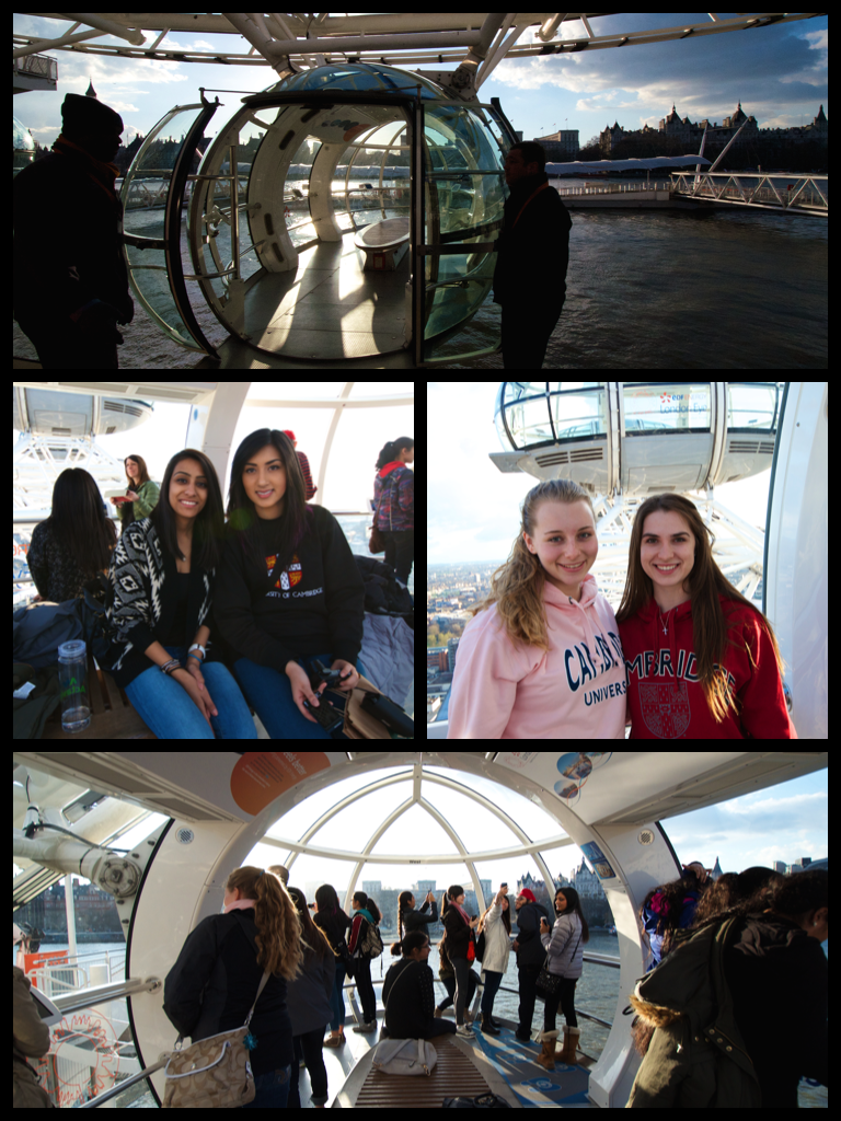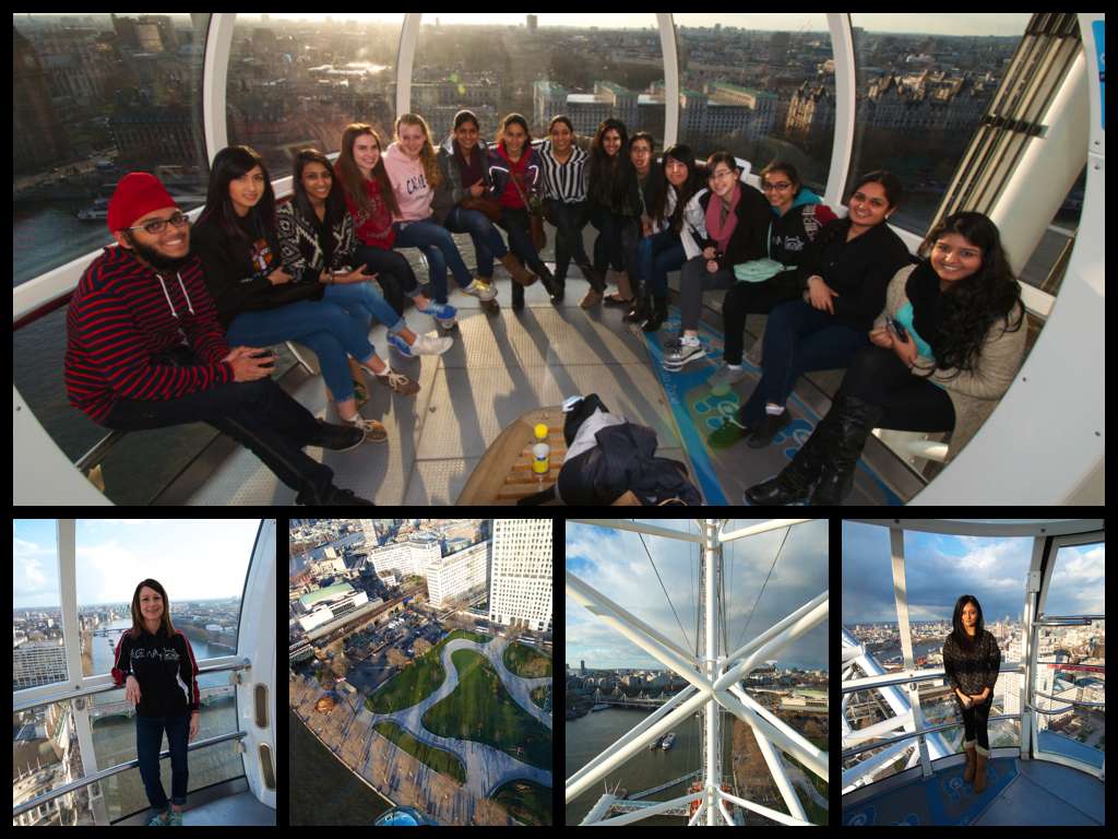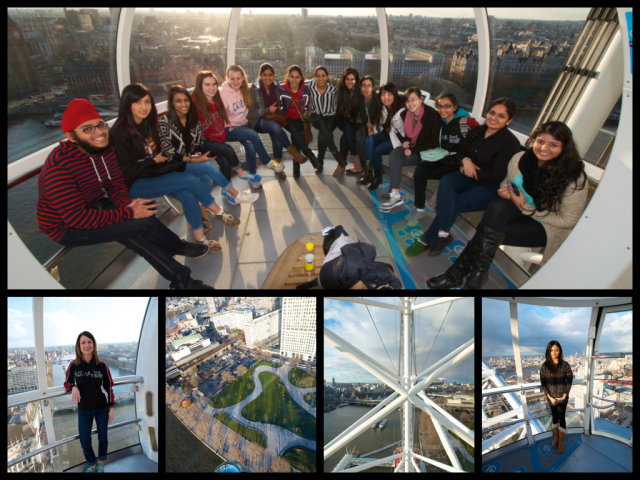| Group sitting on the rails, with London behind them. On the bottom you have Ms. Garr (left) and Ms. Mulji (right) and the views from the capsule in between. |