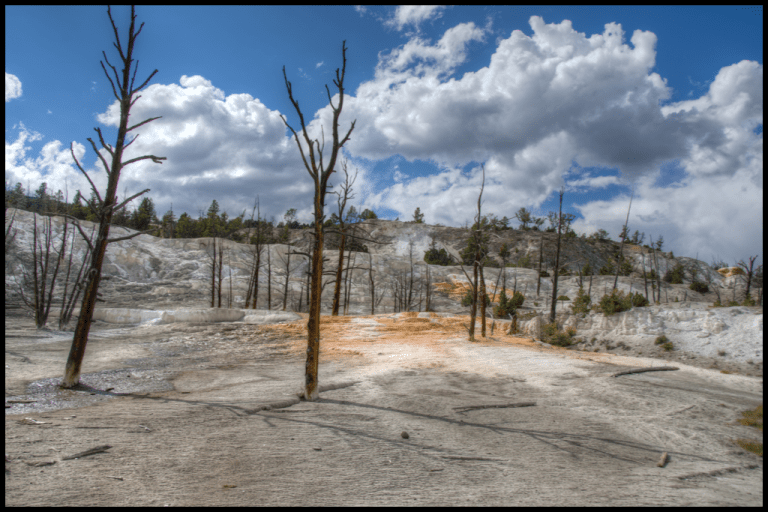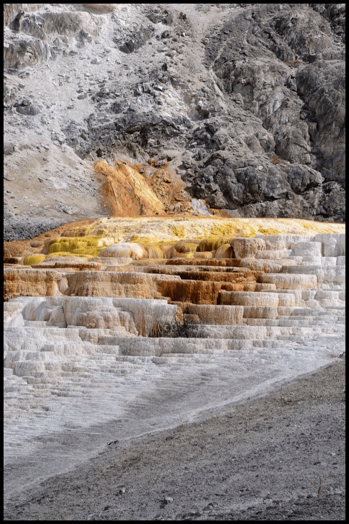 Mammoth Hot Springs is beautiful. The chalky white terraces rich with orange and yellow highlights look out of this world. A series of board walks have been built above the terraces – as they are necessary for safety, and create an ease for walking through and exploring. For those looking to visit, the parking lot at the bottom is easier to access and by far more popular. But if you have a car and no trailer or motorhome, you can drive past this initial lot and around the bend to park at the top. Not only do you get to see some amazing trees living (or dying) in field of calcium carbonate, but you get to view the terraces from the top. It also means you will be hiking down, then back up, instead of up and then back down (this is just a matter of preference). A lot of the key terraces are in the top half, which was great for me, who wasn’t quite adjusted to the altitude yet and happy to walk a few less steps if possible. It’s not a difficult hike, being that it’s stairs and boardwalks, but also not wheelchair accessible from the top. If you are new to being at 6700 feet (this was our first day in the park), you may want to take it easy and allow a lot of time. Also drink lots of water. Headaches and nausea are not uncommon being at this elevation.