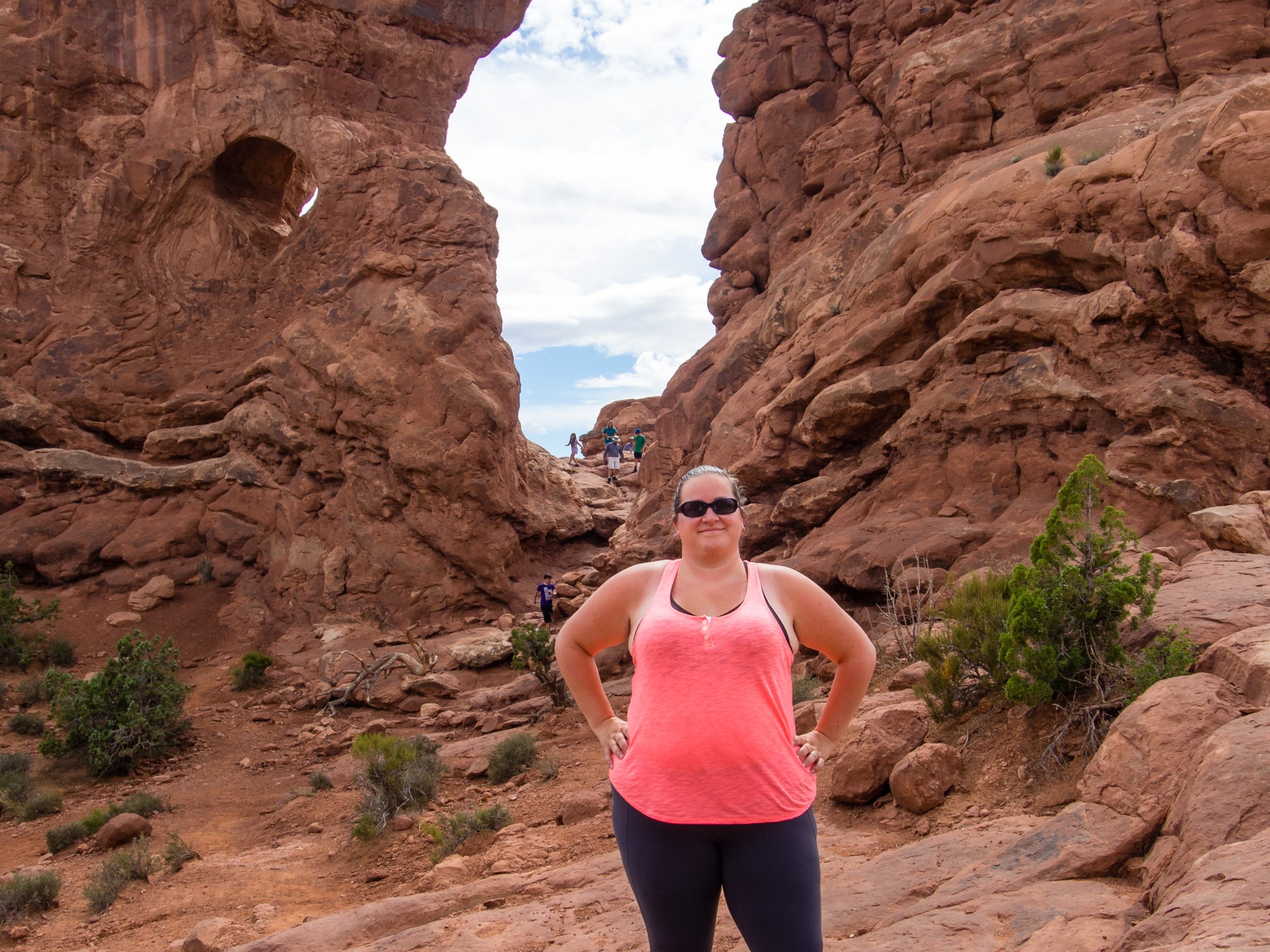 Arches has one way in and one way back. There is a campground at the very end of the park, but it’s a 45 minute drive from the road, and not the most practical place to set up shop for us, given that we also planned a visit to Canyonlands, and needed access to groceries. So we stayed at a nice little campground 4 minutes from the entrance, with shaded awnings and a pool. I was worried when planning this leg of the trip, because Moab is known for having very hot temperatures, and very little shade (desert and all), and I don’t fair well in the heat. So we thought the pool would be a smart choice. Turned out, we had some sun, but also an insane rain storm. So I was grateful for arriving in time for, what I would call, the best weather. As we drove into the park we stopped to see many of the “big” sites. Balanced Rock (with its 0.5 km loop around), the Courthouse, Windows, Turret Arch, Double O Arch, and a few others. The red earth of Arches was fascinating. I had never seen anything to compare. There were some trails to hike among the arches and along the red dirt, staining my shoes red. We thought we would save the “big” site – the delicate arch – for another morning.